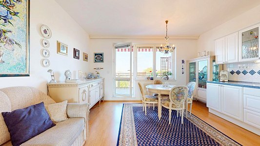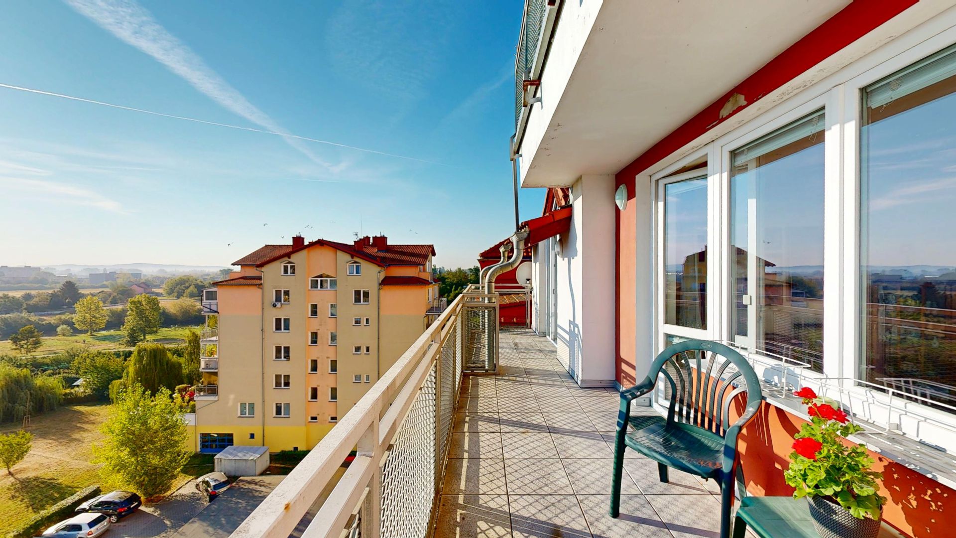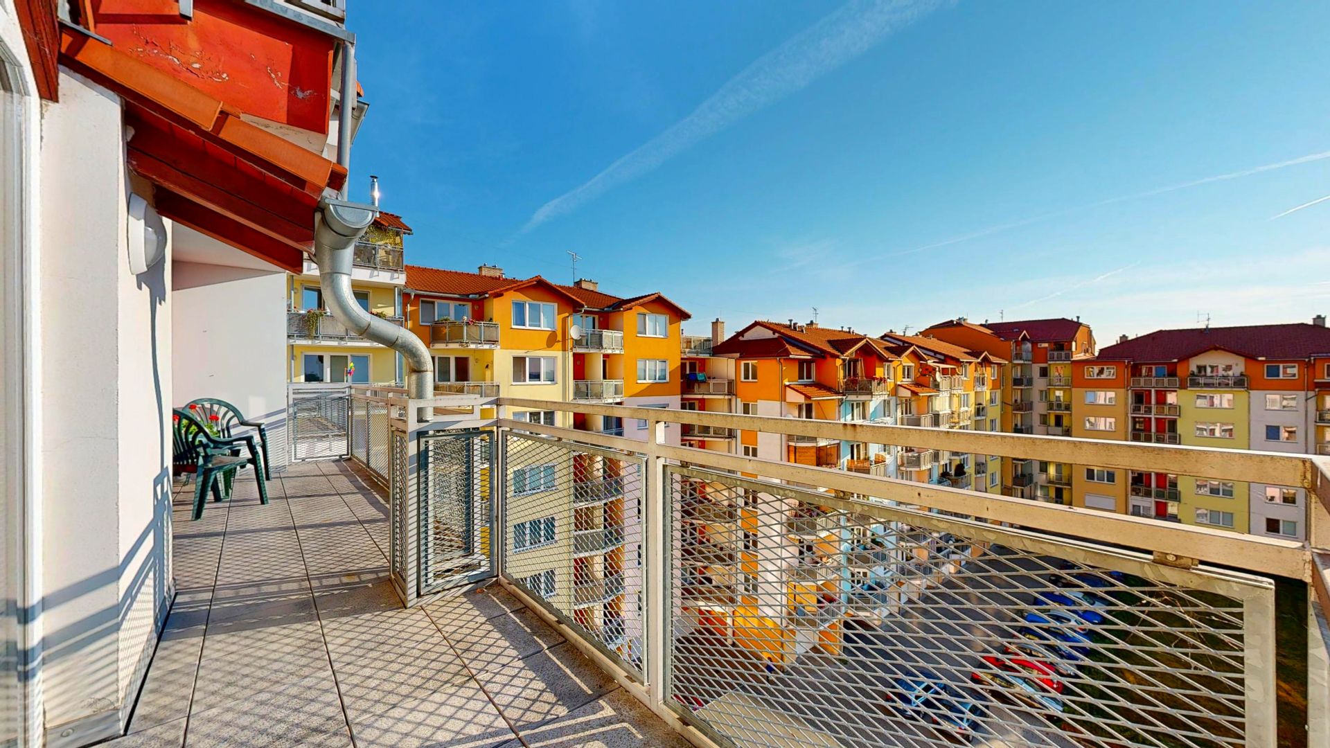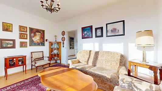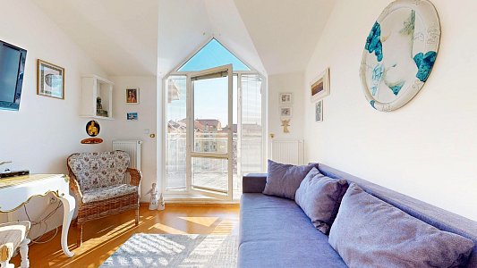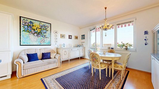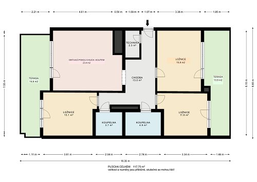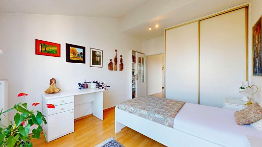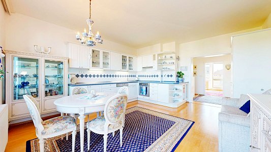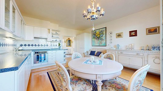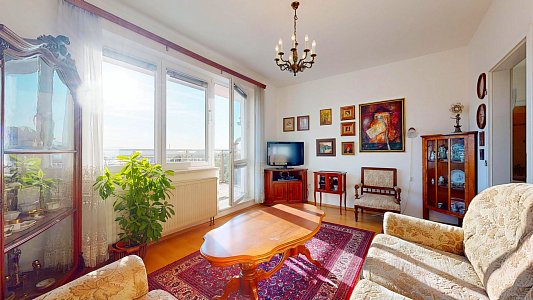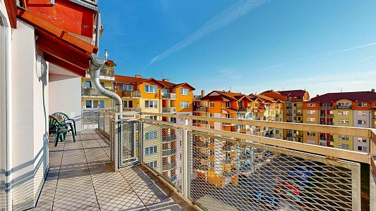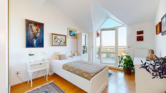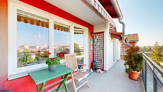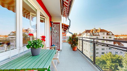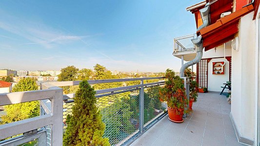 Tento prostorný byt se dvěma terasami a sklepem je umístěn v 6. patře (7. NP) osmipodlažního domu s výtahem a nabízí užitnou plochu celkem 112,58 m2, což zahrnuje byt o velikosti 84,54 m2, terasy o rozloze 12,61 m2 a 11,51 m2 a zděný sklep o výměře 3,92 m2.