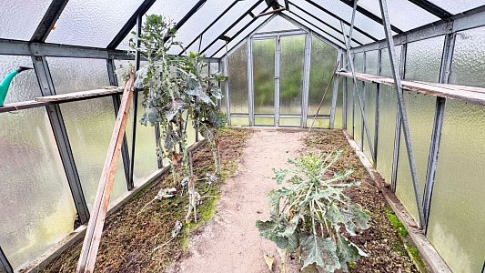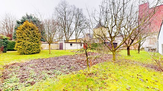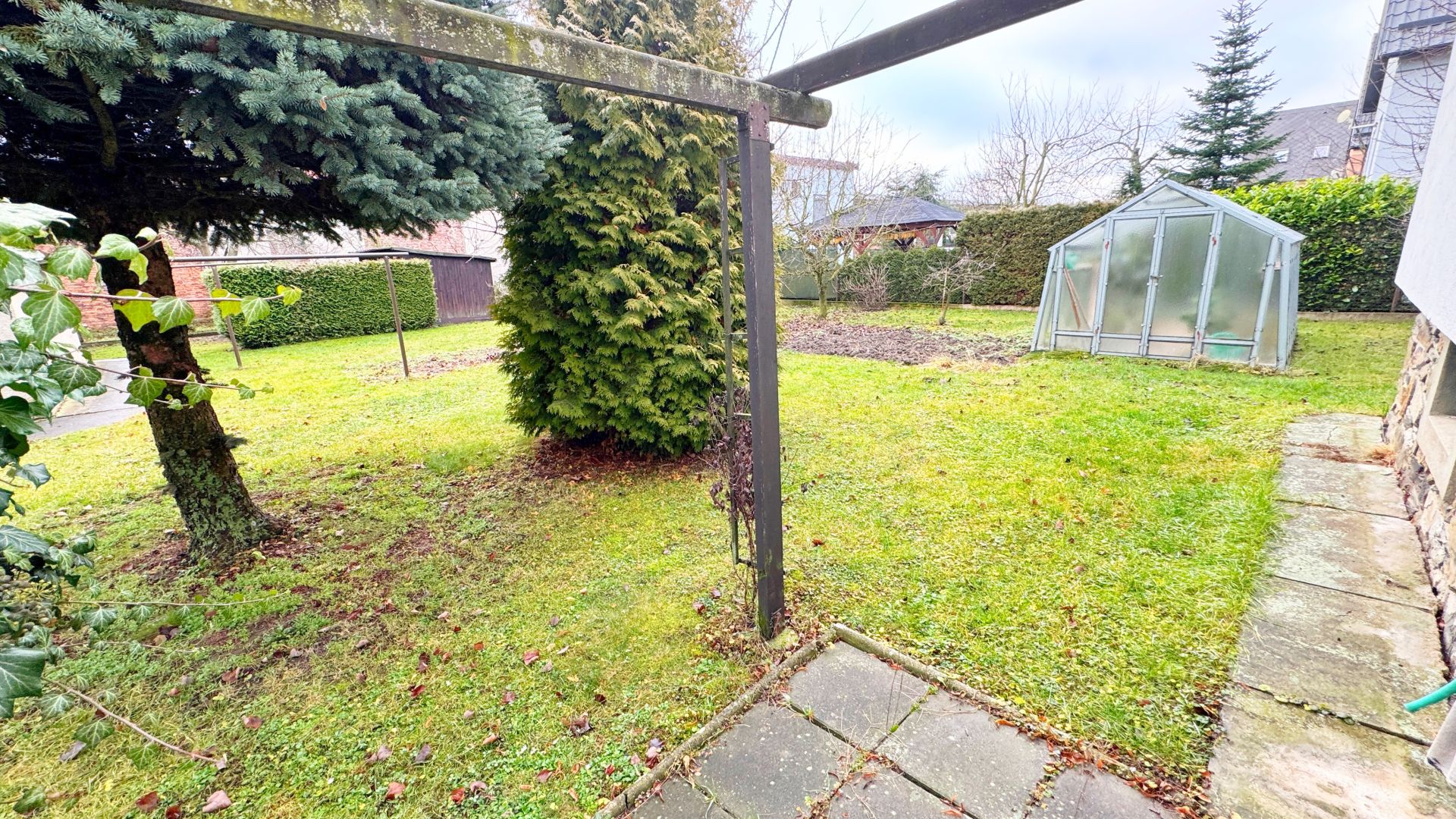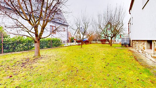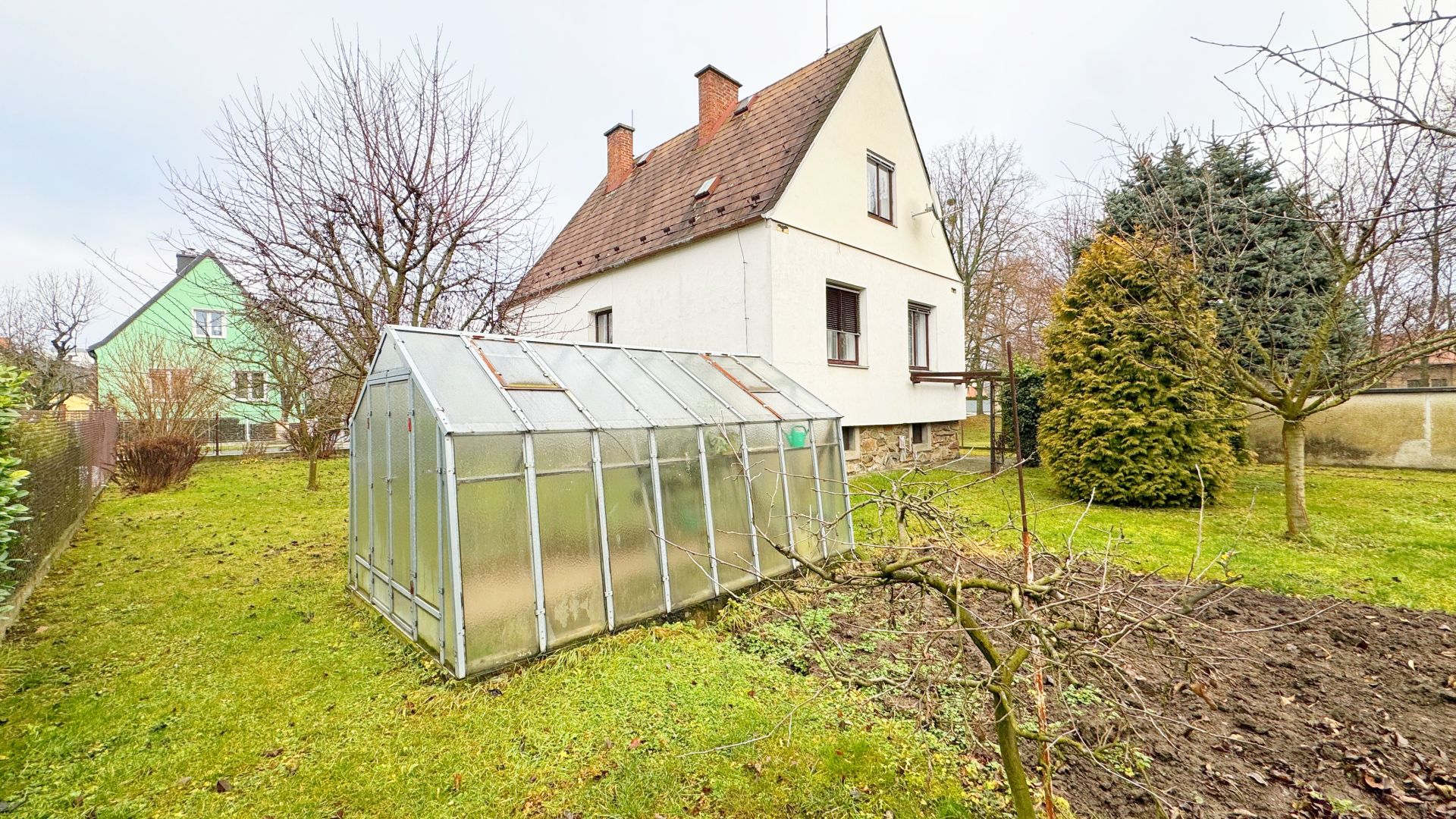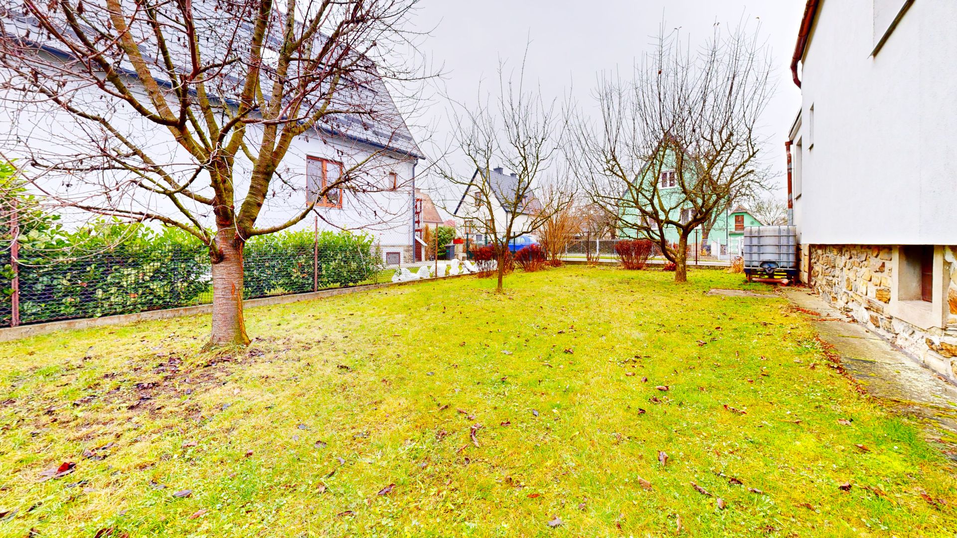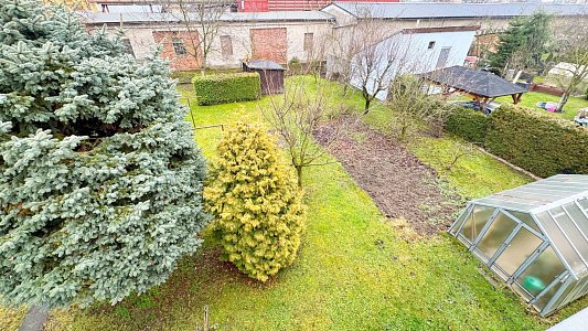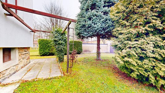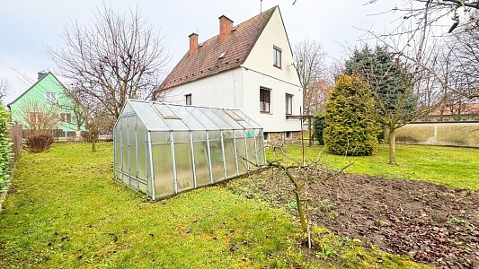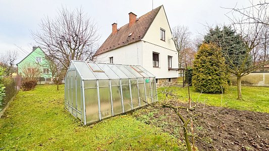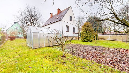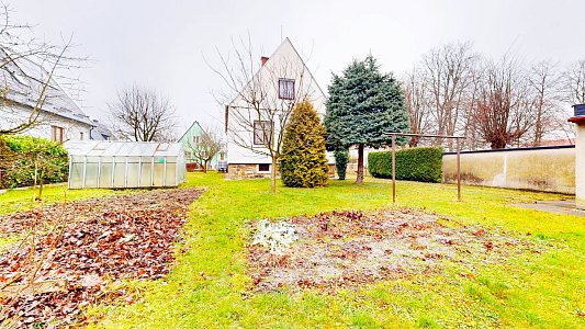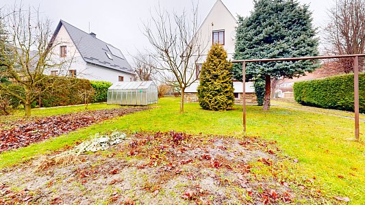 Zahrada je obklopena vzrostlými stromy, ovocnými stromy, skleníkem a záhonem na brambory či zeleninu, což nabízí skvělé možnosti pro pěstování a relaxaci.