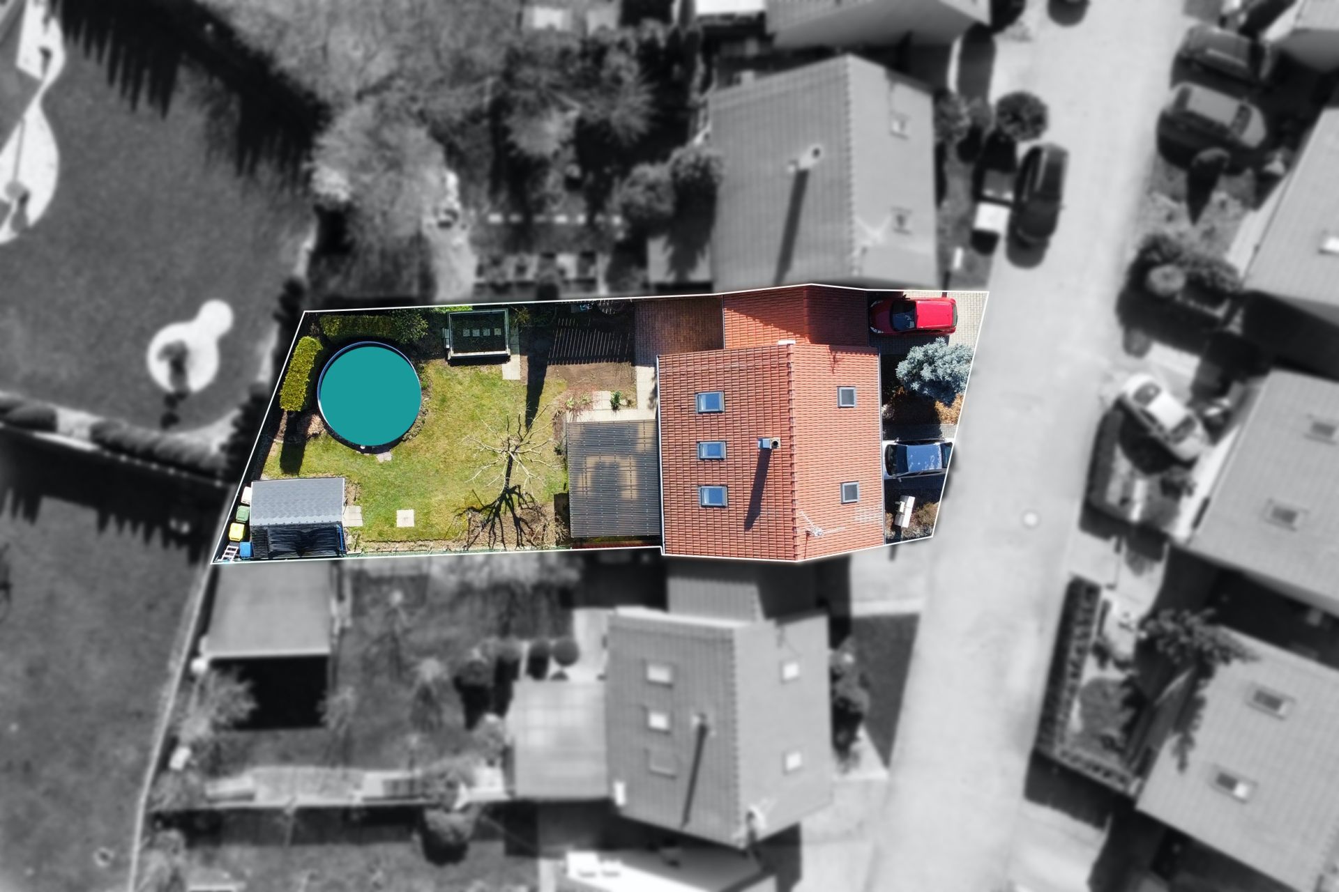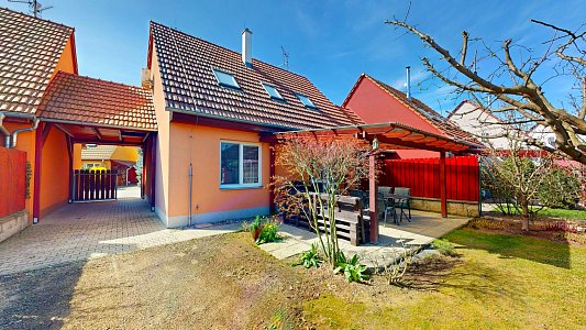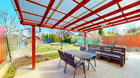 Pozemek o rozloze 348 m2 nabízí mnoho vymožeností včetně parkování pro až 3 auta, zastřešené pergoly s terasou o výměře 24 m2, bazén pro osvěžení v letních dnech, zahradní domek pro úložný prostor. Samozřejmostí je krátce střižený trávník s výsazenými ovocnými stromy (jabloň, broskev, švestka). Kromě toho je na pozemku i studna, která je velkým plusem pro zájemce o zahradničení.
