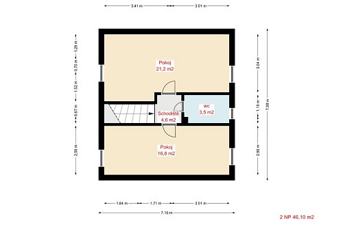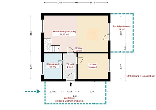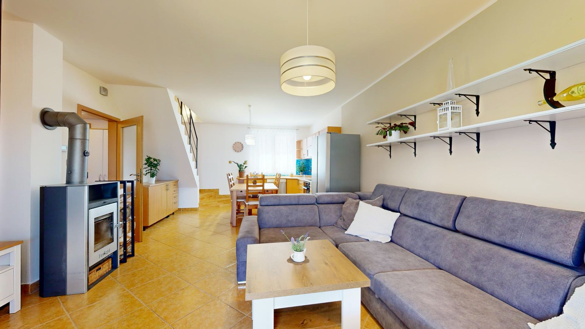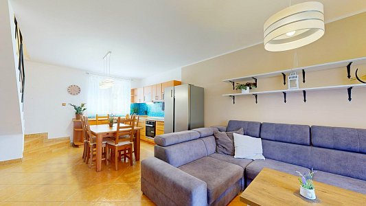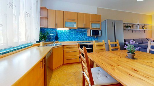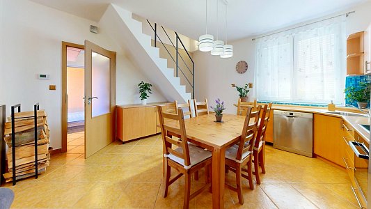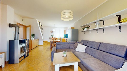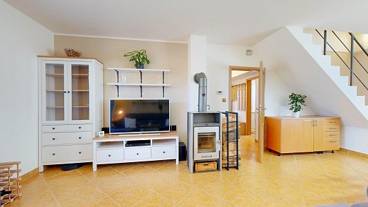 Dům s dispozicí 4+kk je rozdělen do dvou podlaží. V prvním nadzemním podlaží (1NP) se nachází obývací pokoj s krbovými kamny a přímým vstupem na prostornou terasu s pergolou, kuchyň vybavená rohovou kuchyňskou linkou s vestavěnými spotřebiči, ložnice a prostorná koupelna s rohovou vanou a WC. Ve druhém nadzemním podlaží (2NP) jsou umístěny dva neprůchozí pokoje, WC s umyvadlem a vstup na půdu, která poskytuje další úložný prostor.