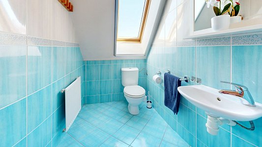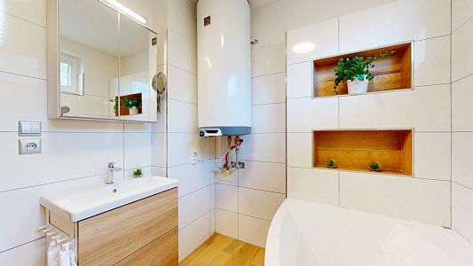 Vytápění v 1NP je řešeno elektrokotlem s teplovodním podlahovým vytápěním, zatímco v 2NP jsou k dispozici radiátory a klimatizace pro maximální komfort po celý rok. Teplá voda je ohřívána elektrickým bojlerem.